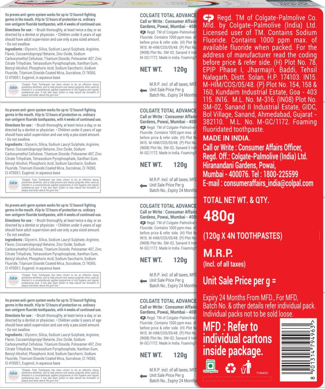 Colgate Total Advance Health Toothpaste (480 g, Pack of 4)