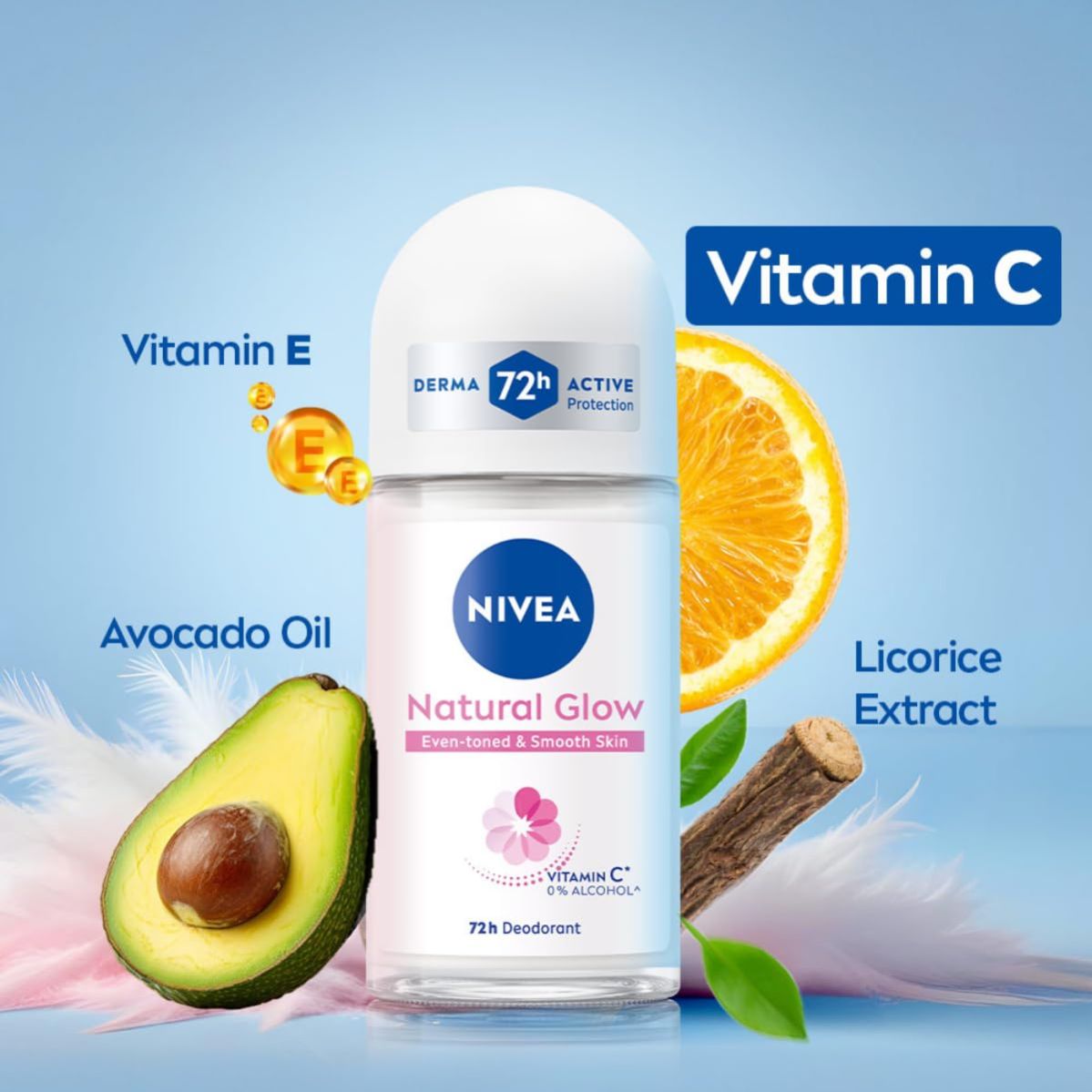 NIVEA Natural Glow Smooth Skin Deodorant Underarm Roll On for Women| Vitamin C, Vitamin E, Avocado oil and Licorice Extract | 72 H Even Toned, Smooth & Bright Underarms | 0% Alcohol and Dermat Approved |50 ml